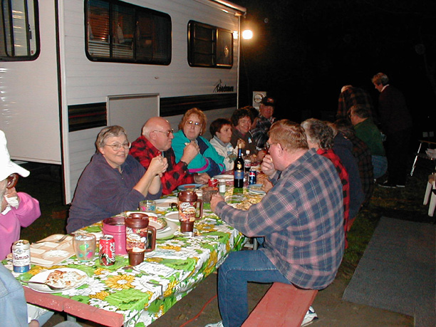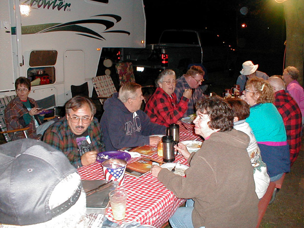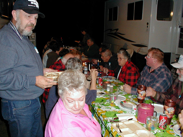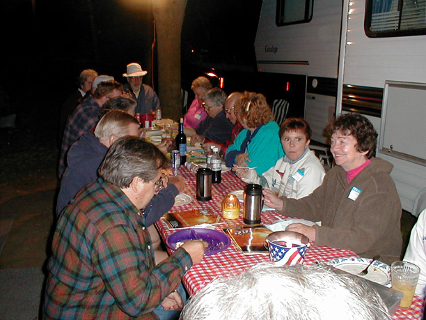 Evening potluck at get togetherThe evening potluck. The weather was nice enough that we didn't need to go to the clubhouse. It did get chilly but that was after dinner.