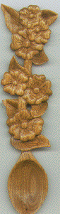 Budding LoveAn original design with a lot of dimention and interest. Flowers symbolize friendship or affection. Maybe this spoon would be a good gift for a budding friendship. A light color wood with subtile graining. Carved from Butternut. Natural finished with semi-gloss Deft. 10" long x 2" wide Price = $65 plus p/h