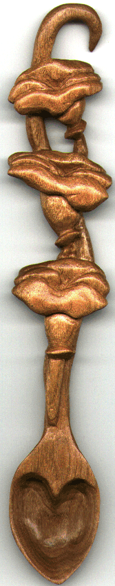 Poppies #4Original Design. Flowers symbolize friendship or affection. A medium color wood with subtle grain. (these photos show it a little darker than it really is.) The heart shaped bowl symbolizes long life or eternal love. Carved from Butternut. Natural finished with semi-gloss Deft. 12.75" long x 2.5" wide |