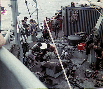 The photo above was taken during Operation Bold Dragon. It shows Seal Team members on the fantail of WEISS after a mission. Click on the image to to see a larger view. This is Swift Boat PFC 38 along side WEISS |