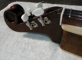 In April 2002, while attending the Escapees Club Woodcarvers get together at North Ranch in Congress AZ, we enjoyed an evening of dulcimer music when about eight of our fellow woodcarvers had a Jam session. Fran was hooked instantly and "had to have one". I was interested to learn that a couple of the players had made their own dulcimers from kits. Well, it wasn't long before we purchased a dulcimer for Fran and a kit for me to build... Fran didn't want to wait for me to finish the kit. I have purchased several kits over the last few years. As a full-time RVer I don't have the luxury or a wood shop full of the necessary tools and machinery needed to make dulcimers from scratch but the kits eliminate that need. Still it does take a few tools that take up space in the RV. It's a lot of hassle to pack the tools away so I don't do any dulcimer work unless we're going to be at a place for a while. Also, since my workshop is the great outdoors the weather has to cooperate so I don't get to make as many as I'd like to. My first MountainDulcimer |
