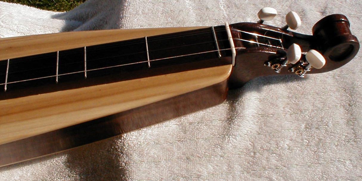 This dulcimer was made from a JENNY WILEY DULCIMER Scratch Kit designed by Jeff Lambert from Stinson Creek Dulcimers. It's all solid wood made from dark walnut and poplar. I wasn't sure about the poplar since it has a gray, green, yellow color. But a few applications of tung oil gave the wood a really pretty color. The sides of the sound box are poplar but stained to complement the walnut woods. The walnut was also stained to give it a rich, antique feeling. I also substituted bone for the walnut nut and bridge pieces that come with the kit. No good reason except that I like the white and think it offers a nice contrast to the dark wood. I don't know if the bone changed the sound since this is my first dulcimer. I also added a 6 1/2 fret. Something Fran says allows her to play more songs. The extra fret is now an option that Jeff offers. The instructions for the kit are adequate to complete the building of the dulcimer but could be more detailed. Also, the instructions are not included with the kit anymore. You have to access the Stinson Creek web site to get them. Probably not a big deal but then my web browser doesn't always print the pages the way it should. I would vote for having real paper instructions included and the online instructions for backup and updates/additions. In any event you can always email Jeff with any questions. |